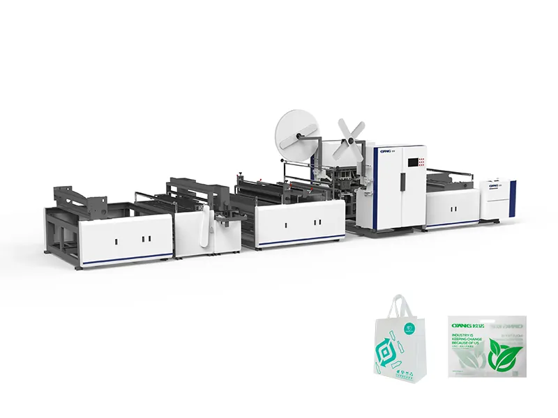 This machine is professionally suitable to make non woven manual box bag. Automatic loading the raw material and cutting the non woven fabric into different width sheets with handle and stitching online . This machine is equipped with edge-fold function, have 2 sets ultrasonic can sealing the fabric side with standard pattern,and also with online handle attachment,have 6 sets ultrasonic in this unit,also attached stitching unit,make the handle sealing more strong. Motor frequency control, automatic counting, using heavy quality cutting knife to cut, It is widely used in bag making, printing and packaging industry.